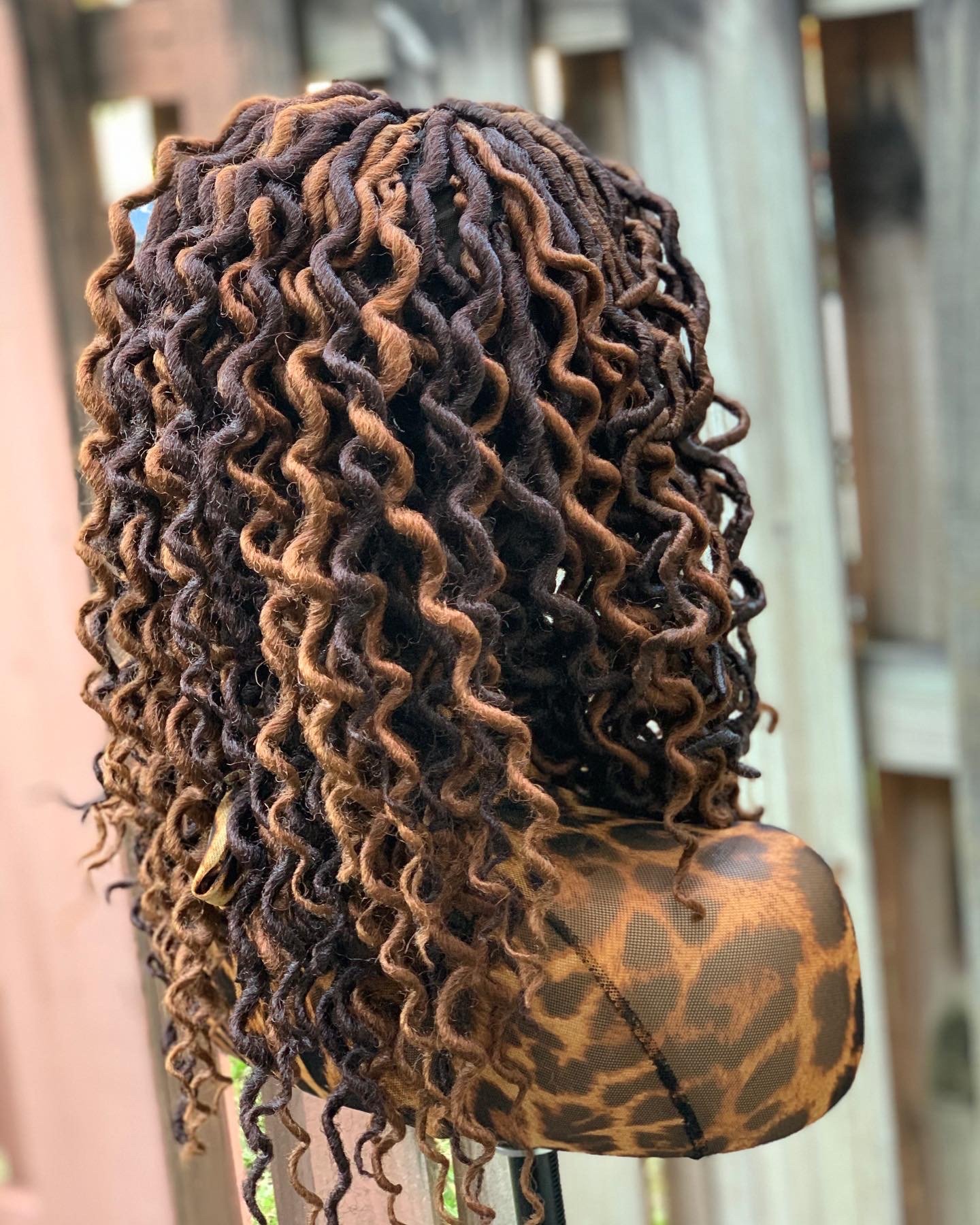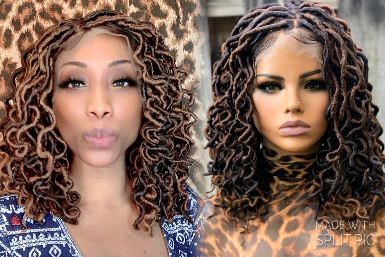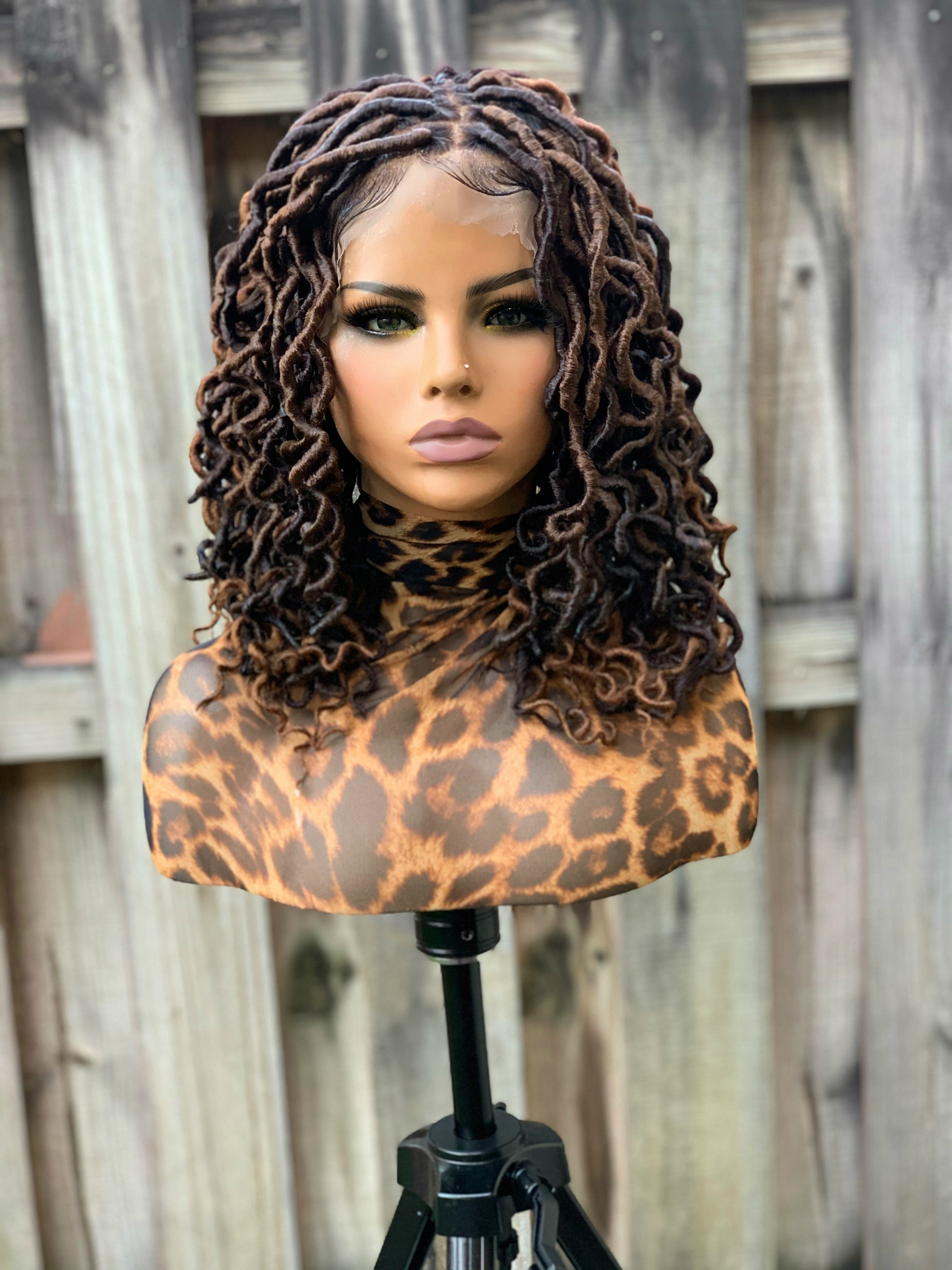 Hand made Curly Faux Locs Lacefront wig fits most heads. The front of wig is Loc Extensions,while the back is crochet synthetic faux locs. The back is sewn in making the wig light wear. Lacefront has 5" parting space from ear to ear. Lacefront is bleached for a more realistic look. Bob length measures from 10" -14". Choose your color below.