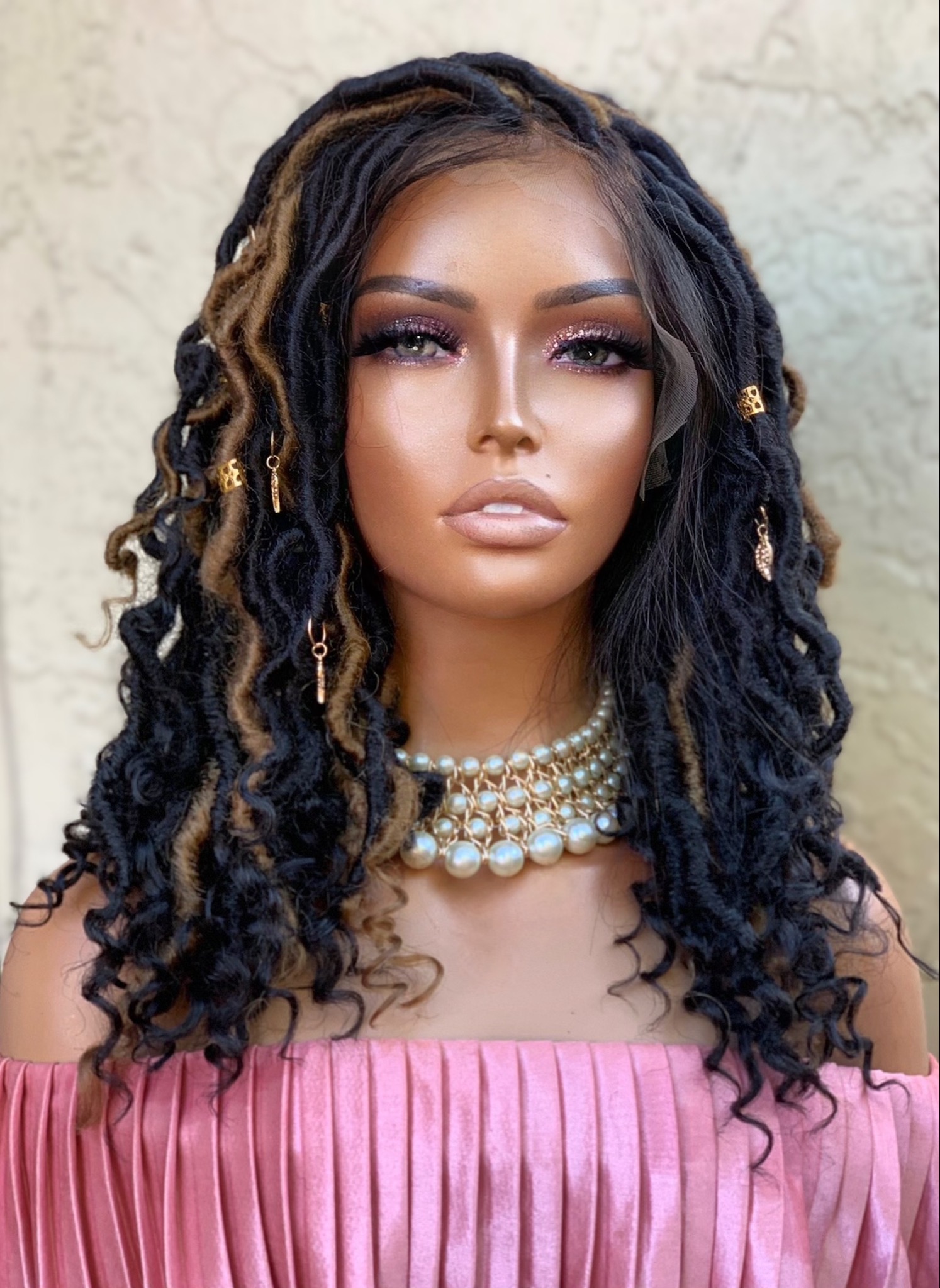 Empress Faux Locs Lacefront wig fits most heads. Front of wig is Loc Extensions, back is crochet synthetic faux locs sewn in making wig feel lighter on head. Lacefront has 5" parting space from ear to ear. Lacefront knots are lightly bleached for a more realistic look.
